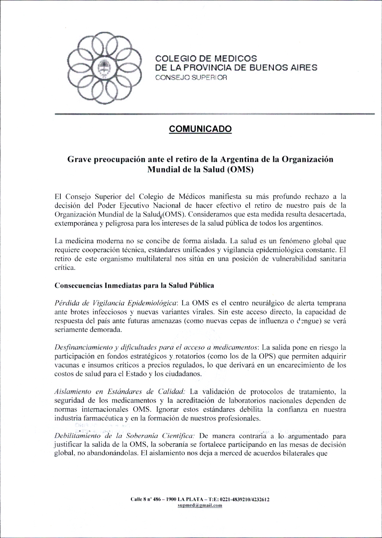 Expresamos el más profundo rechazo del Consejo Superior a la desición del Poder Ejecutivo de hacer efectivo el retiro de nuestro país de la Organización Mundial de la Salud.