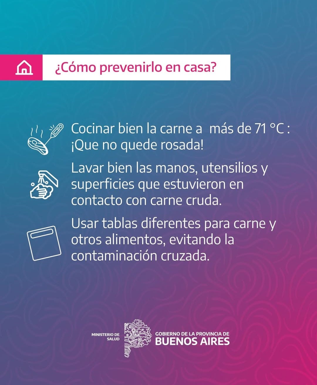 -Correcta cocción de carne de cerdo y otros animales de caza como jabalí a 71 ° o más por más de un minuto, tiene que desaparecer el color rosado y no perder más jugo. No se consideran seguros para la prevención de Triquinosis los métodos de ahumado, curado, congelamiento, salazón o cocción en microondas.